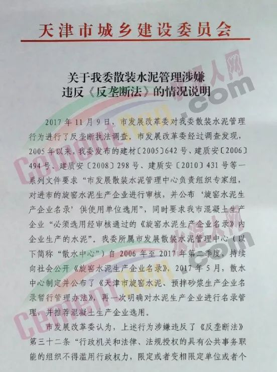 隨后,天津市城鄉(xiāng)建設(shè)委員會發(fā)布《關(guān)于我委散裝水泥管理涉嫌違反<反壟斷法>的情況說明》,明確表示:通過溝通交流,進一步提高了認(rèn)識,深刻認(rèn)識到日常管理中存在的薄弱環(huán)節(jié),委領(lǐng)導(dǎo)要求積極進行整改,立即發(fā)文廢止相關(guān)文件。