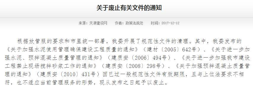 12月中旬,天津市場城鄉(xiāng)建設(shè)委員會發(fā)布《關(guān)于廢止有關(guān)文件的通知》,《關(guān)于加強水泥使用管理確保建設(shè)工程質(zhì)量的通知》(建材〔2005〕642號)、《關(guān)于進一步加強水泥、預(yù)拌混凝土質(zhì)量管理的通知》(建質(zhì)安〔2006〕494號)、《關(guān)于進一步加強我市建設(shè)工程禁止現(xiàn)場攪拌砂漿工作的通知》(建質(zhì)安〔2008〕298號)、《關(guān)于加強預(yù)拌混凝土質(zhì)量管理的通知》(建質(zhì)安〔2010〕431號)等文件。