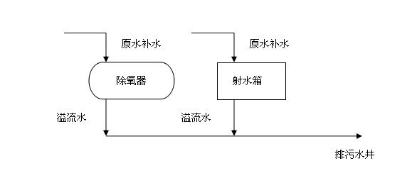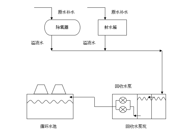 甘肅金泥集團(tuán)有限責(zé)任公司干法二廠余熱電站總投資2800萬元,投產(chǎn)以來每年新增利潤(rùn)數(shù)萬元,節(jié)約標(biāo)準(zhǔn)煤1.074萬噸,減排二氧化碳2.58萬噸。該余熱電站將原水通過活性炭過濾器及多介質(zhì)過濾器降低水體的濁度、除去懸浮雜質(zhì)、凈化水質(zhì),再經(jīng)過反滲透系統(tǒng)除去水中的微粒、有機(jī)物質(zhì)、膠體物和無機(jī)的陽(yáng)離子、陰離子等水中雜質(zhì),進(jìn)而得到除鹽水,再由物理除氧方式將其中氧氣剝離打進(jìn)鍋爐,經(jīng)高溫廢氣加熱至過熱蒸汽帶動(dòng)汽輪發(fā)電機(jī)做功發(fā)電,做功后的蒸汽再經(jīng)過循環(huán)水冷凝除氧進(jìn)入鍋爐,如此往復(fù)形成一個(gè)汽水循環(huán)。要保證其穩(wěn)定運(yùn)行,就需要將其中每一個(gè)環(huán)節(jié)做得一絲不茍,但面對(duì)北方水質(zhì)偏硬的現(xiàn)實(shí)問題,為了將循環(huán)水的硬度降至標(biāo)準(zhǔn)值不得不加大補(bǔ)水排污量,可是這樣又造成了不必要的水資源浪費(fèi),故對(duì)余熱電站內(nèi)除氧器及射水箱的工業(yè)補(bǔ)水溢流水進(jìn)行了下圖所示的回收水系統(tǒng)改造。