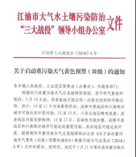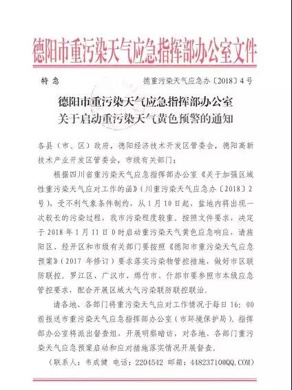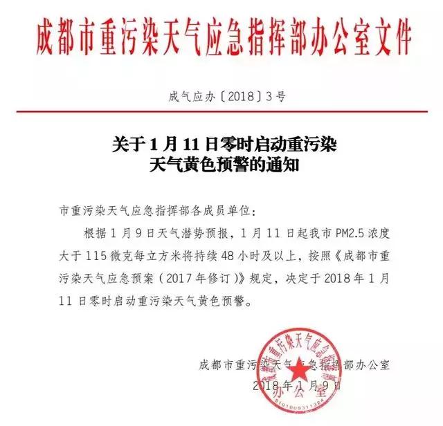 根據(jù)省環(huán)境監(jiān)測總站和省氣象臺會商研判,成都、自貢、瀘州、德陽、綿陽、遂寧、內(nèi)江、樂山、 宜賓、達州、雅安、眉山、資陽13個城市將采取聯(lián)防聯(lián)控措施,于1月11曰零時同步啟動重污染天氣黃色預警。
