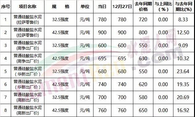 高爭建材、華新水泥、高新雪蓮等水泥生產(chǎn)企業(yè),針對全區(qū)重點項目執(zhí)行政府指導價,分別為普通硅酸鹽32.5(強度)500元、普通硅酸鹽42.5(強度)600元、普通硅酸鹽52.5(強度)800元,與上周持平。