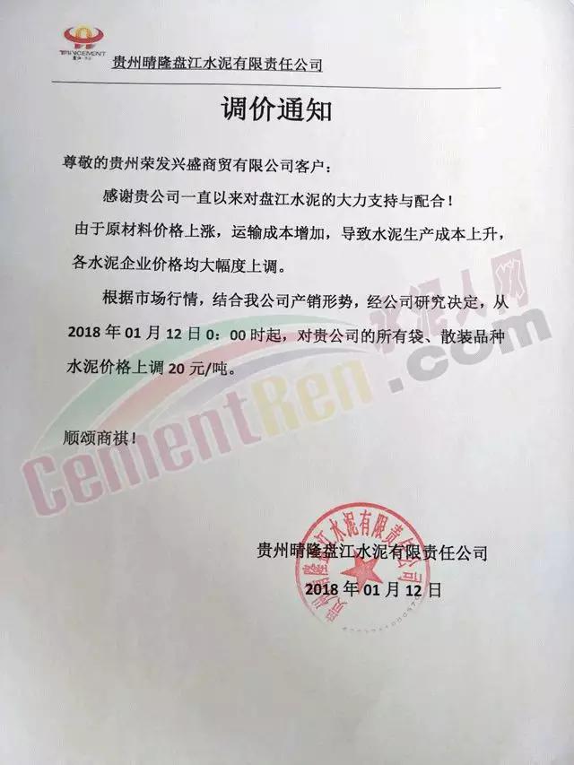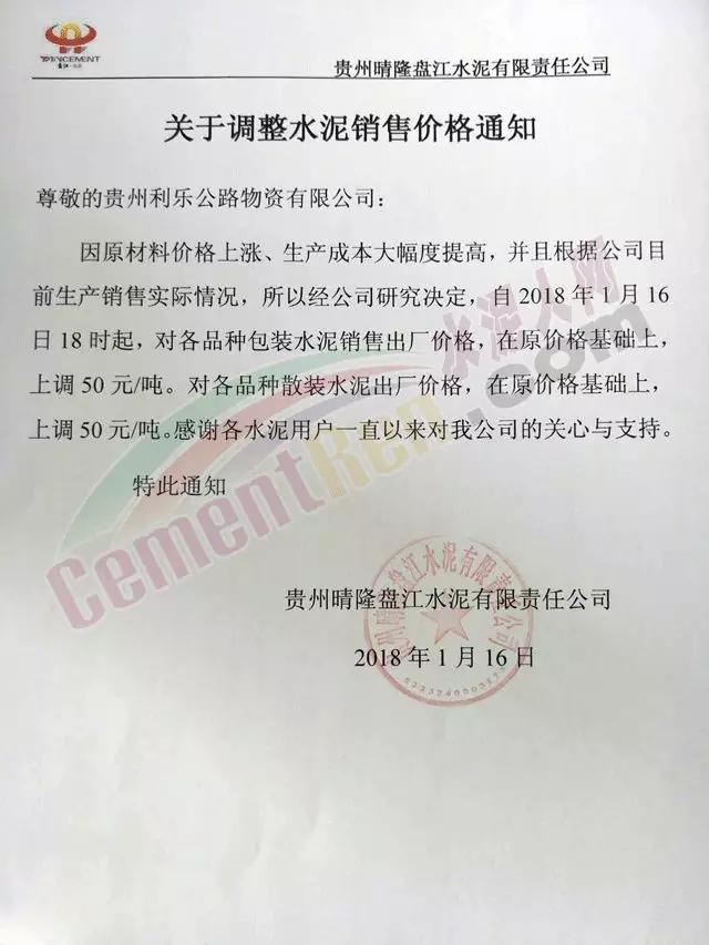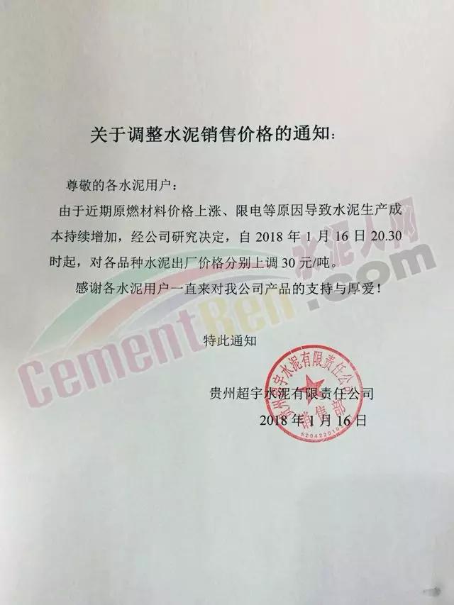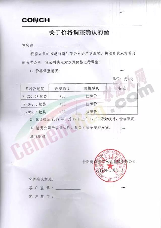 通知,根據(jù)當(dāng)前限電情況、市場形勢及我公司產(chǎn)銷情況,經(jīng)公司研究決定,2018年1月17日12點對P.C32.5、P.O42.5、P.O52.5散裝水泥價格分別上調(diào)30元/噸,感謝您長期以來對貴陽海螺的支持與惠顧。
