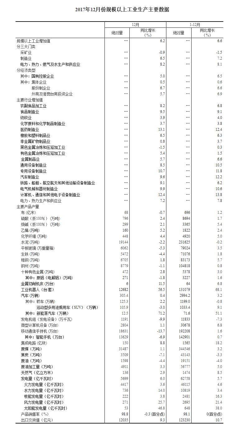 分經(jīng)濟(jì)類型看,12月份,國(guó)有控股企業(yè)增加值同比增長(zhǎng)5.0%;集體企業(yè)增長(zhǎng)0.5%,股份制企業(yè)增長(zhǎng)6.7%,外商及港澳臺(tái)商投資企業(yè)增長(zhǎng)5.7%。