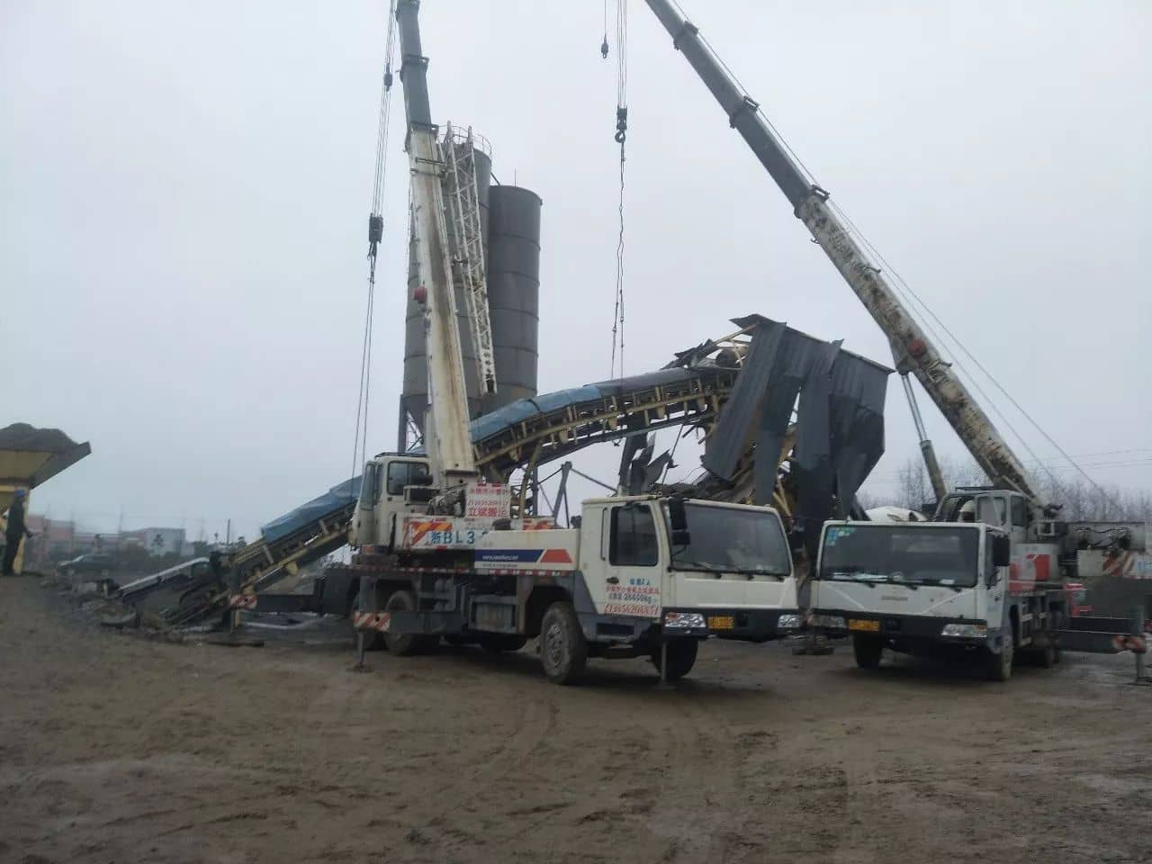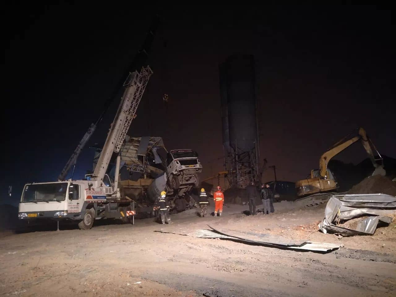 隨后,救援人員立即找來兩臺大型吊機(jī),利用吊機(jī)嘗試著把坍塌的水泥罐和散落的鋼板慢慢吊起,在現(xiàn)場人員的指揮下,吊機(jī)開始作業(yè)——利用鋼絲繩固定好位置后,慢慢地將罐體向上拉,在兩輛大型的吊機(jī)牽拉下,水泥罐體緩緩地離開了地面。