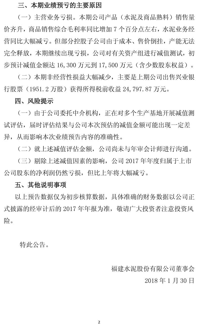 (一)主營(yíng)業(yè)務(wù)虧損。本期公司產(chǎn)品(水泥及商品熟料)銷(xiāo)售量?jī)r(jià)齊升,商品銷(xiāo)售綜合毛利率同比增加7個(gè)百分點(diǎn)左右,水泥業(yè)務(wù)經(jīng)營(yíng)同比大幅減虧。但部分控股子公司由于成本、售價(jià)倒掛,產(chǎn)能無(wú)法完全釋放,本期繼續(xù)出現(xiàn)虧損,公司對(duì)有關(guān)資產(chǎn)組進(jìn)行減值測(cè)試,初步預(yù)計(jì)減值金額達(dá)16,300萬(wàn)元到17,500萬(wàn)元(含少數(shù)股東權(quán)益)。