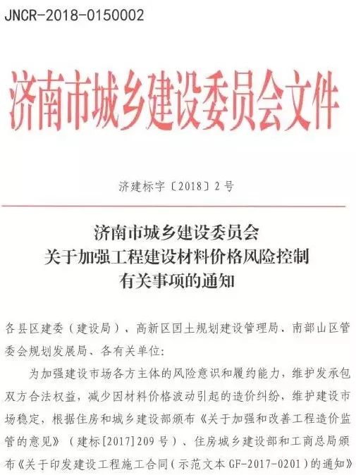 2018年1月30日,濟(jì)南市住建委印發(fā)《關(guān)于加強(qiáng)工程建設(shè)材料價格風(fēng)險控制有關(guān)事項的通知》(濟(jì)建標(biāo)字〔2018〕2號),明確工程計價中應(yīng)推行風(fēng)險共擔(dān)和合理分?jǐn)傇瓌t,承包人應(yīng)有限度承擔(dān)材料價格等市場風(fēng)險。