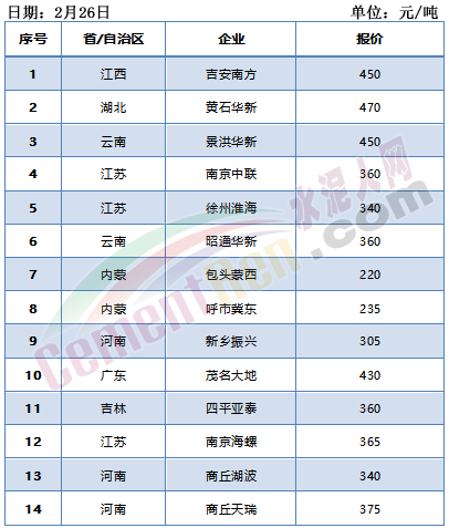 部分企業(yè)PC32.5袋裝水泥出廠報(bào)價(jià)