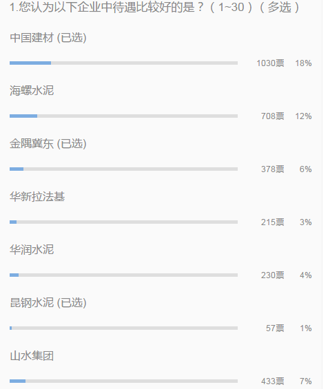 2017年12月15日,水泥人網(wǎng)發(fā)起“您認(rèn)為以下企業(yè)中待遇比較好的是?”民調(diào)活動(dòng),通過7天的網(wǎng)絡(luò)投票,武安新峰水泥以1162票勝出,據(jù)了解,武安新峰水泥每月工資按時(shí)足額發(fā)放,武安新峰不僅是花園式的企業(yè),也是工資加管理的一流企業(yè),福利高,還有機(jī)會(huì)出國(guó)。可以看出員工對(duì)企業(yè)的信賴度之高,為這家企業(yè)點(diǎn)贊。