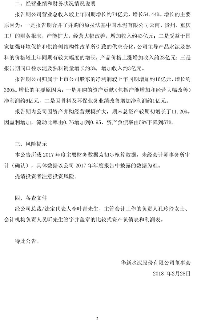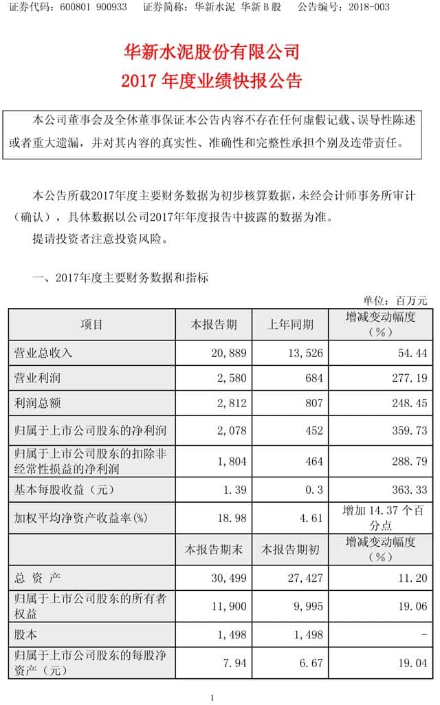 【水泥人網(wǎng)】華新水泥昨日(27日)晚間發(fā)布業(yè)績(jī)快報(bào),公司2017年?duì)I收208.89億元,同比增長(zhǎng)54.44%;凈利潤(rùn)20.78億元,同比增長(zhǎng)359.73%;