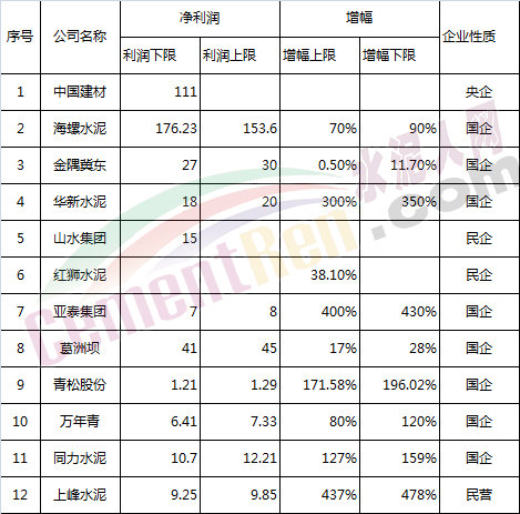 從部分水泥的業(yè)績(jī)預(yù)告來(lái)看,按照業(yè)績(jī)?cè)鲩L(zhǎng)下限,已公布業(yè)績(jī)的部分國(guó)營(yíng)水泥企業(yè)利潤(rùn)總額約為398.55億,占了整個(gè)行業(yè)總利潤(rùn)的45.4%,這只是已公布的水泥上市公司的業(yè)績(jī)預(yù)告,這其中還沒(méi)包括沒(méi)有出業(yè)績(jī)預(yù)報(bào)的福建水泥、華潤(rùn)水泥等一部分水泥企業(yè)的業(yè)績(jī)。