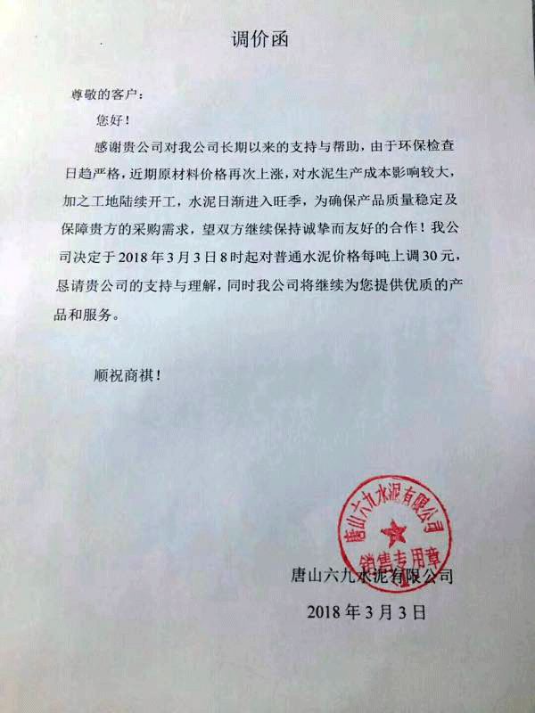 唐山六九水泥有限公司調(diào)價(jià)函: