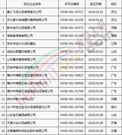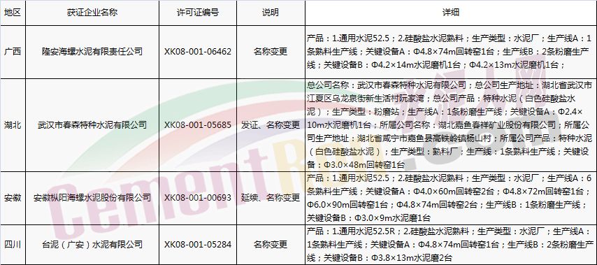 【水泥人網(wǎng)】國家質(zhì)檢總局于本月2日、8日分別放發(fā)本月第1批和批2批水泥企業(yè)生產(chǎn)許可證。其中涉及新發(fā)證書的23家,涉及到期延續(xù)的16家企業(yè),涉及變更的16家企業(yè)。