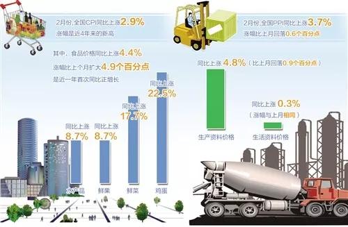 交通銀行首席經(jīng)濟(jì)學(xué)家連平分析認(rèn)為,CPI同比上漲2.9%是近4年來的新高,也可能是今年年內(nèi)的高位。今年春節(jié)假期全在2月,消費(fèi)需求旺盛,與此同時,氣溫偏低影響食品生產(chǎn)供應(yīng)。食品價格同比上漲4.4%,漲幅比上個月擴(kuò)大4.9個百分點(diǎn),是近一年來首次同比正增長。其中雞蛋、鮮菜、鮮果、水產(chǎn)品等食品價格大幅走高,同比漲幅分別達(dá)到22.5%、17.7%、8.7%、8.7%。此外,去年2月份CPI同比漲幅僅有0.8%,為全年最低,低基數(shù)對今年同期CPI有明顯的抬升作用。