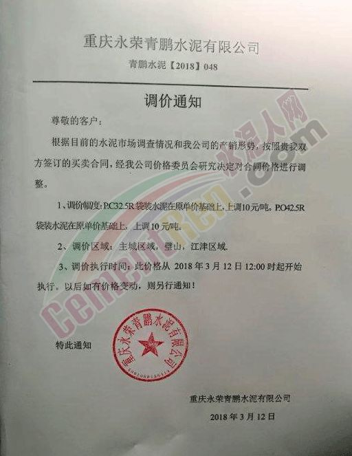 以上兩份調(diào)價通知,一份通知是PO42.5R散裝在原單價基礎(chǔ)上上調(diào)50元/噸, 另是一份是針對于重慶主城區(qū)、璧山,江津區(qū)域PC32.5R袋裝水泥在原單價基礎(chǔ)上上調(diào)10元/噸,PO42.5R袋裝水泥在原基礎(chǔ)上上調(diào)10元/噸。