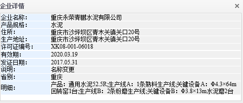 質(zhì)檢總局信息中心數(shù)據(jù)顯示,重慶永榮青鵬水泥有限公司位于重慶市沙坪壩區(qū)青木關(guān)鎮(zhèn)關(guān)口20號 。
