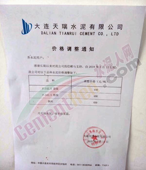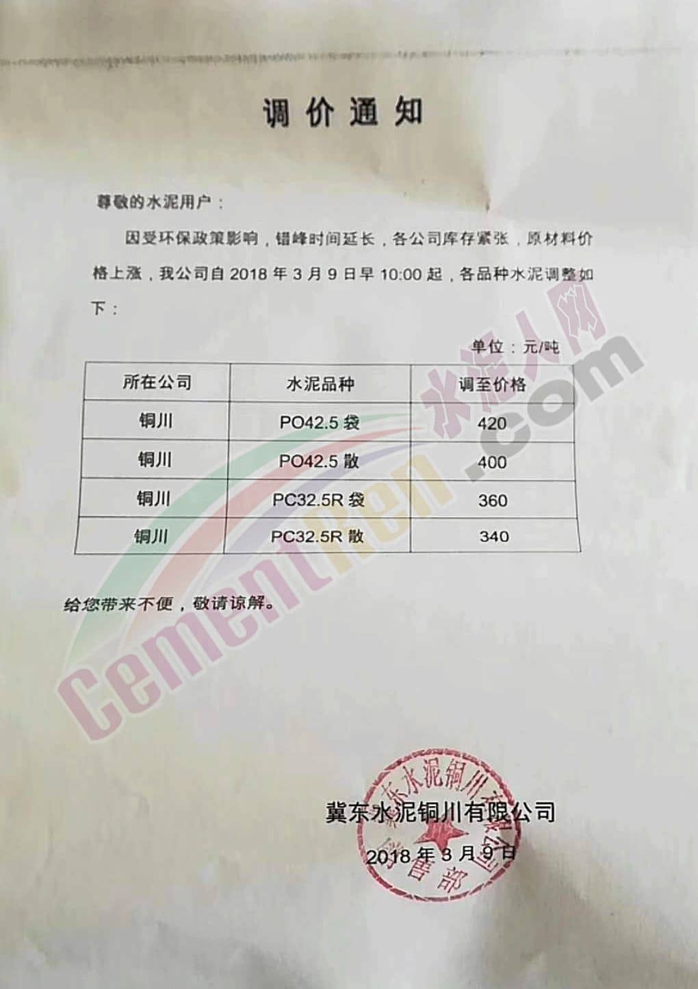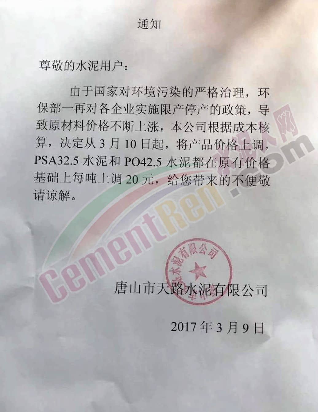 3月9日唐山市豐潤(rùn)區(qū)鴻誠(chéng)水泥有限公司發(fā)布通知稱由于國(guó)家對(duì)環(huán)境污染的嚴(yán)格治理,環(huán)保部一再對(duì)企業(yè)實(shí)施限產(chǎn)停產(chǎn)政策,導(dǎo)致原材料價(jià)格不斷上漲,公司根據(jù)成本核算決定自3月9日20:00起水泥價(jià)格在原有價(jià)格基礎(chǔ)上上調(diào)20元/噸。