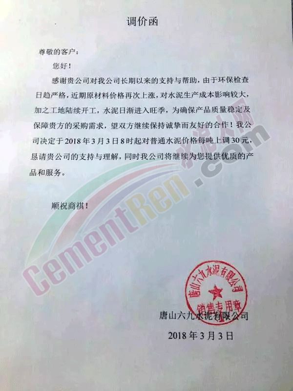 3月3日唐山六九水泥有限公司發(fā)調(diào)價(jià)函稱,由于環(huán)保檢查日趨嚴(yán)格,近期原材料價(jià)格再度上漲,對(duì)水泥生產(chǎn)成本影響較大,加之工地陸續(xù)開工,水泥日漸進(jìn)入旺季,為確保產(chǎn)品質(zhì)量穩(wěn)定及保障下游客戶采購(gòu)需求,公司決定對(duì)普通水泥價(jià)格上調(diào)30元/噸。