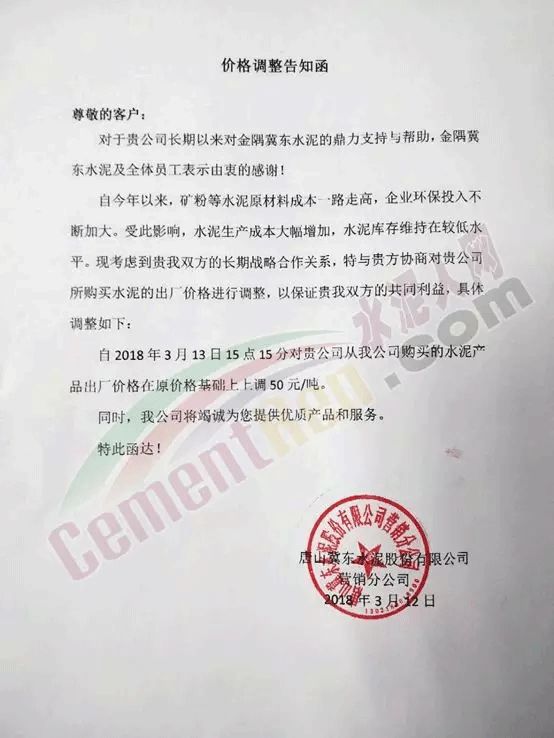 3月12日唐山區(qū)域龍頭企業(yè)唐山冀東水泥股份有限公司發(fā)出價(jià)格調(diào)整告知函,告知下游客戶因礦粉等原材料成本一路走高,企業(yè)環(huán)保投入不斷加大,水泥生產(chǎn)成本增加,水泥庫(kù)存維持在較低水平,為保證正常的銷售供應(yīng)自3月13日起各標(biāo)號(hào)水泥出廠價(jià)上調(diào)50元/噸。
