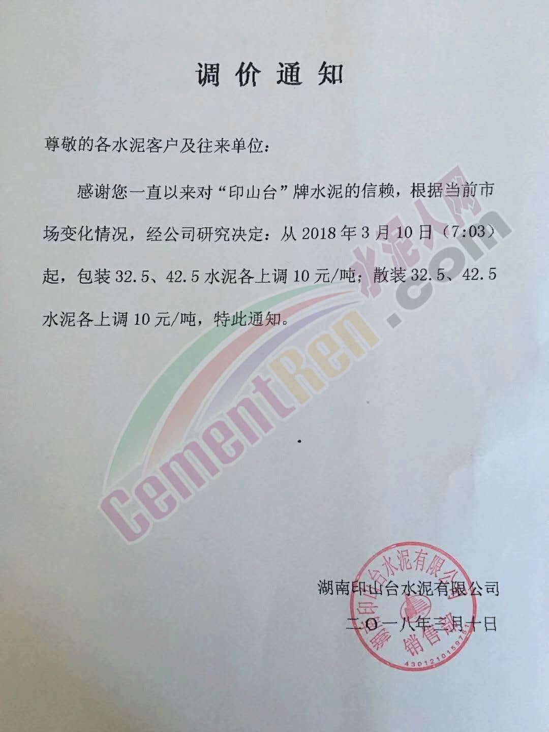 3月10日湖南區(qū)域印山臺(tái)水泥有限公司通知自3月10日起對(duì)旗下各規(guī)格水泥價(jià)格上調(diào)10元/噸。