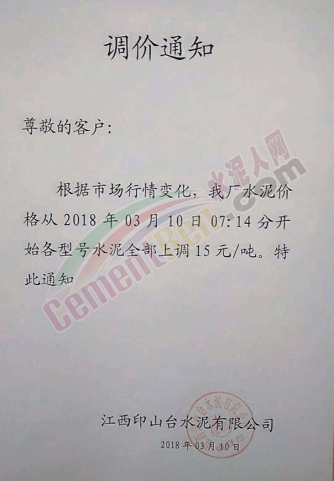 3月10日江西省印山臺(tái)水泥通知上調(diào)15元 /噸