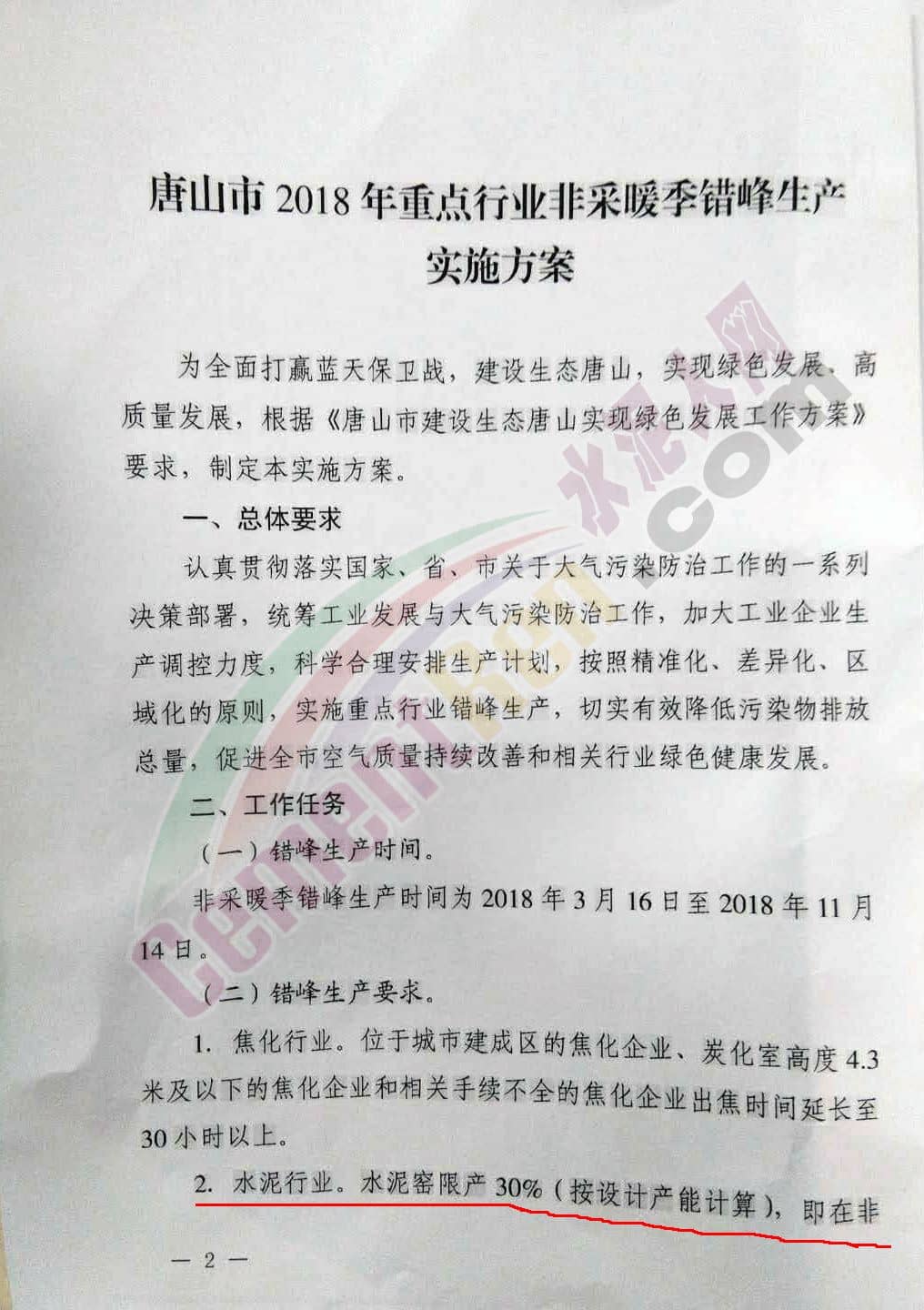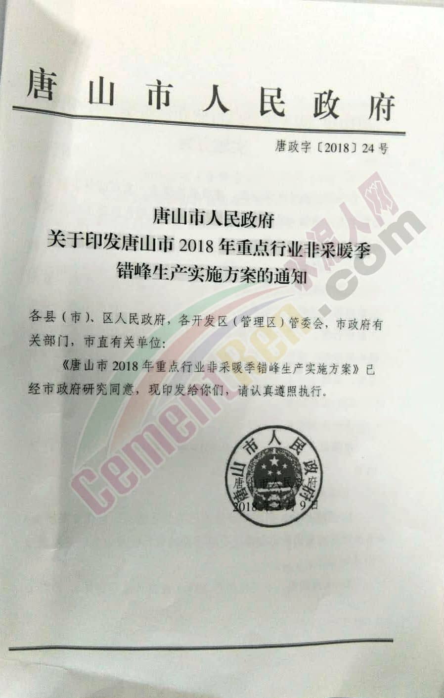 【水泥人網(wǎng)】日前,唐山市人民政府發(fā)布《唐山市2018年重點(diǎn)行業(yè)非采暖季錯(cuò)峰生產(chǎn)實(shí)施方案》,方案要求水泥等重點(diǎn)行業(yè)在非采暖季執(zhí)行錯(cuò)峰生產(chǎn)任務(wù),錯(cuò)峰生產(chǎn)時(shí)間為2018年3月16日至2018年11月14日。