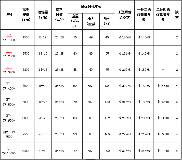 HJ窯尾強旋流燃燒器采用旋流擴散型單通道燃燒器,采用了高氣固比低風量、強旋流、煤粉濃縮等技術(shù),由高溫三次風的迅速卷入大大縮短了煤粉預(yù)熱時間,提高和改善了火焰根部的環(huán)境和溫度,使煤粉在燃燒器出口就能迅速燃燒,有效提高煤粉燃盡率及物料分解效率,穩(wěn)定分解爐內(nèi)的熱工工藝。HJ窯尾強旋流燃燒器主要技術(shù)參數(shù)表如下: