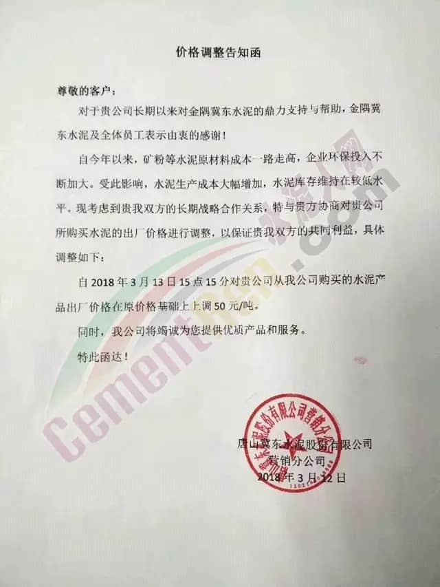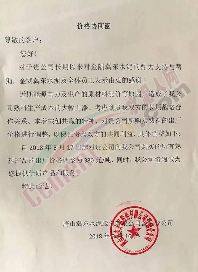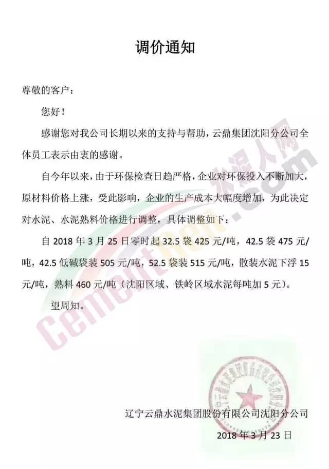 以山東山水水泥集團(tuán)有限公司、亞泰集團(tuán)、北方水泥有限公司、遼寧恒威水泥集團(tuán)、大連水泥集團(tuán)、撫順大伙房水泥有限公司,六家企業(yè)共同成立的云鼎水泥集團(tuán)也發(fā)布了漲價(jià)涵!