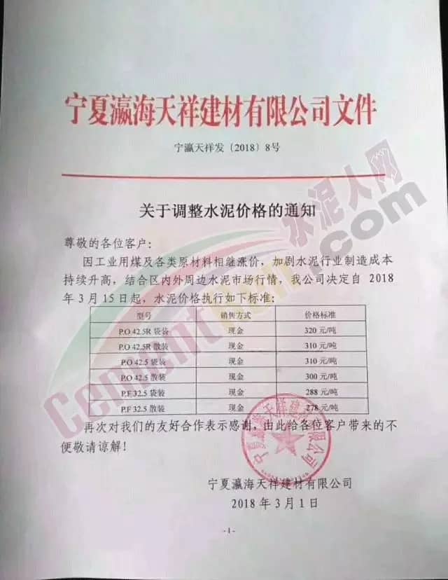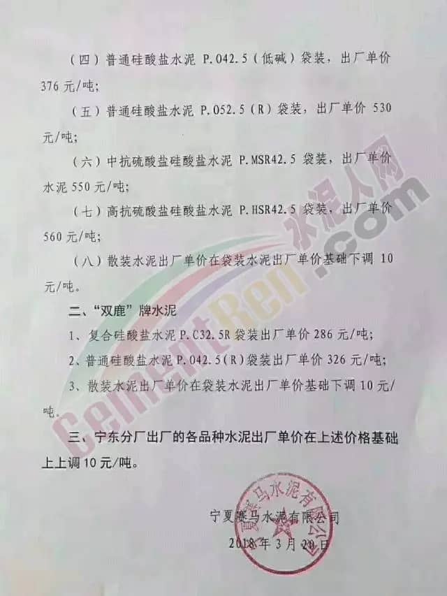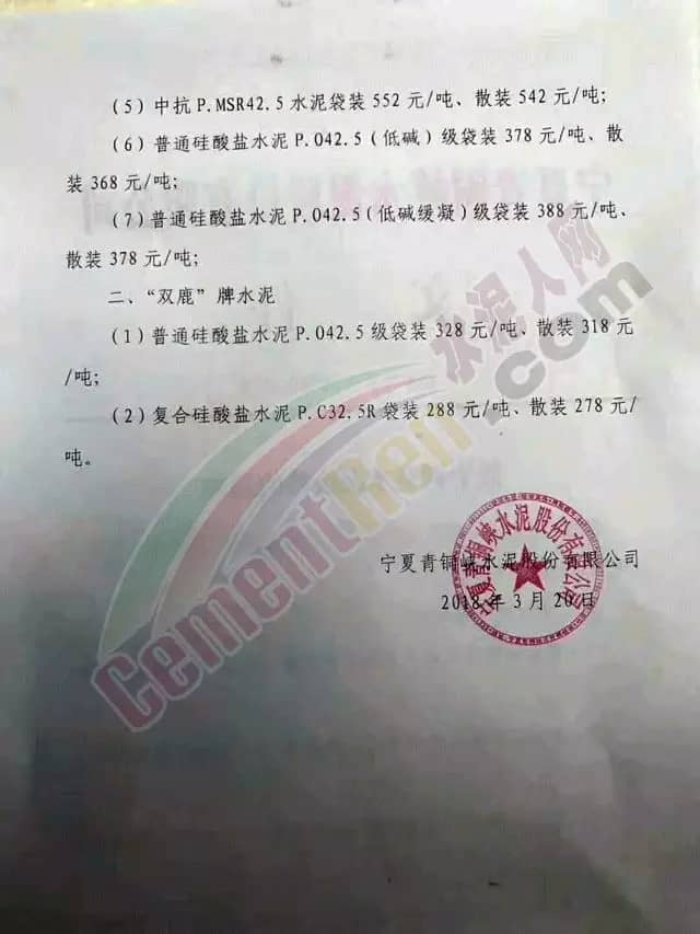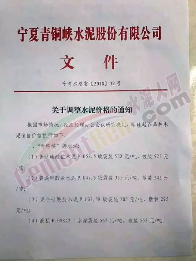 寧夏青銅峽水泥股份有股公司調(diào)價(jià)通知
