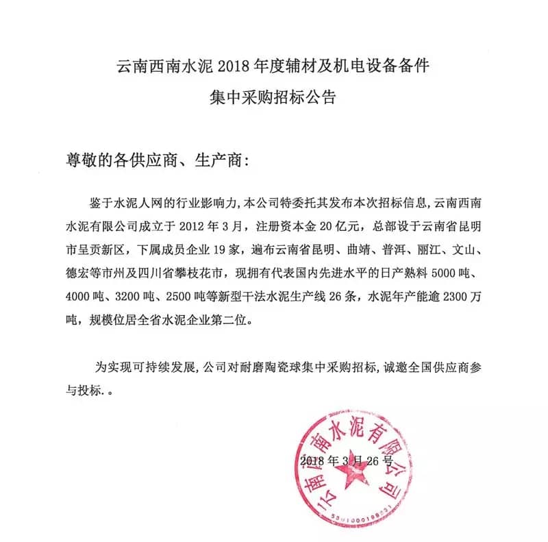 為了做好云南西南下屬19家成員企業(yè)2018年度生產(chǎn)用陶瓷耐磨球的招議標(biāo)采購工作,誠(chéng)邀云南西南下屬19家成員企業(yè)的機(jī)電設(shè)備原制造供貨廠及其他同類制造企業(yè)參加,以滿足云南西南下屬成員企業(yè)生產(chǎn)的機(jī)電設(shè)備備件及輔助材料的需求,共同打造云南西南長(zhǎng)期穩(wěn)定合作、互惠共贏的供應(yīng)商渠道?,F(xiàn)將相關(guān)招標(biāo)采購信息發(fā)布如下: