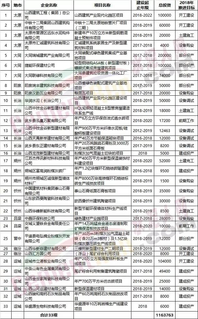 2018年山西省建材工業(yè)重點(diǎn)項(xiàng)目