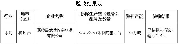 經(jīng)縣、市、省級三級現(xiàn)場驗收和驗收結(jié)果公示,現(xiàn)將蕉嶺縣龍騰旋窯水泥有限公司拆除水泥(熟料)產(chǎn)能驗收合格予以通告。 通告全文如下: