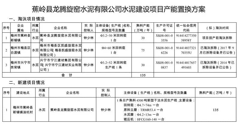其中,向社會公告能耗不達標應(yīng)限期整改的企業(yè)名單(“黃牌”名單),涉及9家企業(yè)(鋼鐵、平板玻璃、陶瓷企業(yè)各1家,水泥企業(yè)6家),目前均在整改期內(nèi);待企業(yè)整改到期復(fù)查后再公布經(jīng)整改仍不達標、已依法關(guān)閉企業(yè)名單(“紅牌”名單)。技術(shù)方面淘汰關(guān)停的93家企業(yè)名單、主要設(shè)備(生產(chǎn)線)和產(chǎn)能情況均已向社會公示、公告。審核了水泥行業(yè)建設(shè)項目產(chǎn)能置換方案(蕉嶺縣龍騰旋窯水泥有限公司熟料水泥生產(chǎn)線建設(shè)項目的產(chǎn)能置換方案)