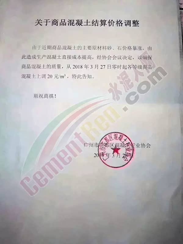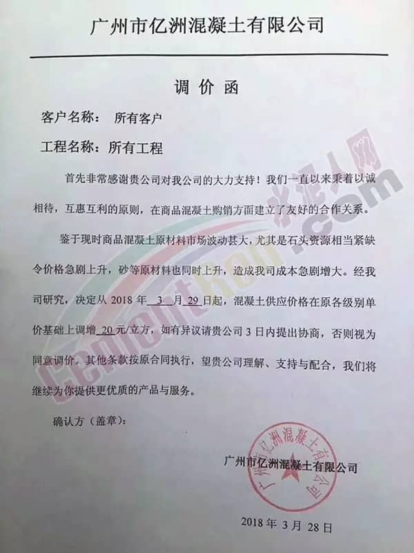 為繼續(xù)保質(zhì)保量提供優(yōu)質(zhì)產(chǎn)品,從成本增加的角度考慮,自即日起混凝土企業(yè)將各品種混凝土價(jià)格在原基礎(chǔ)上上調(diào),上調(diào)幅度在20元/立方~30元/立方。