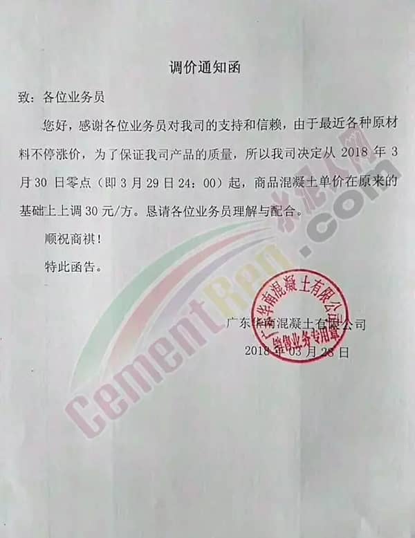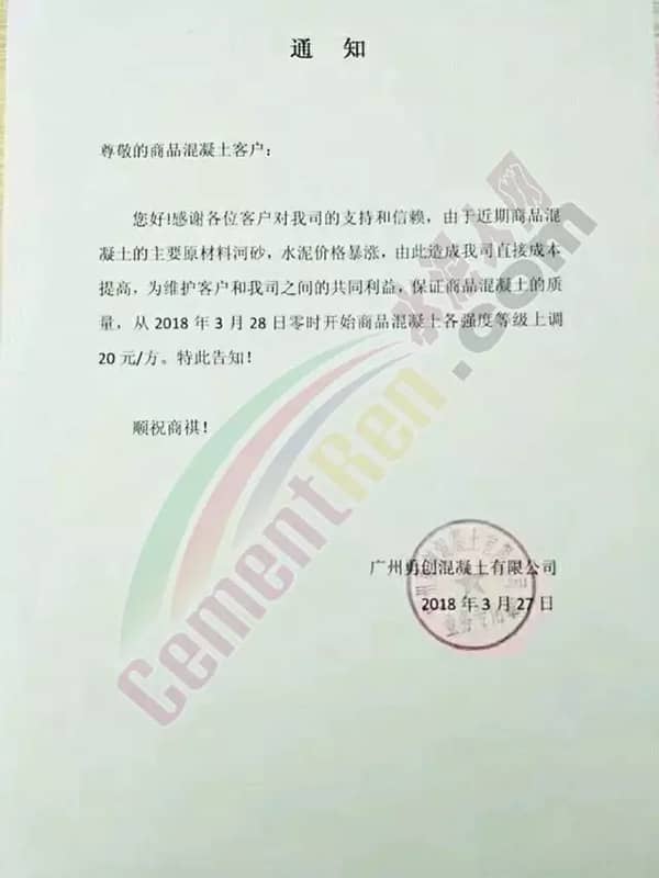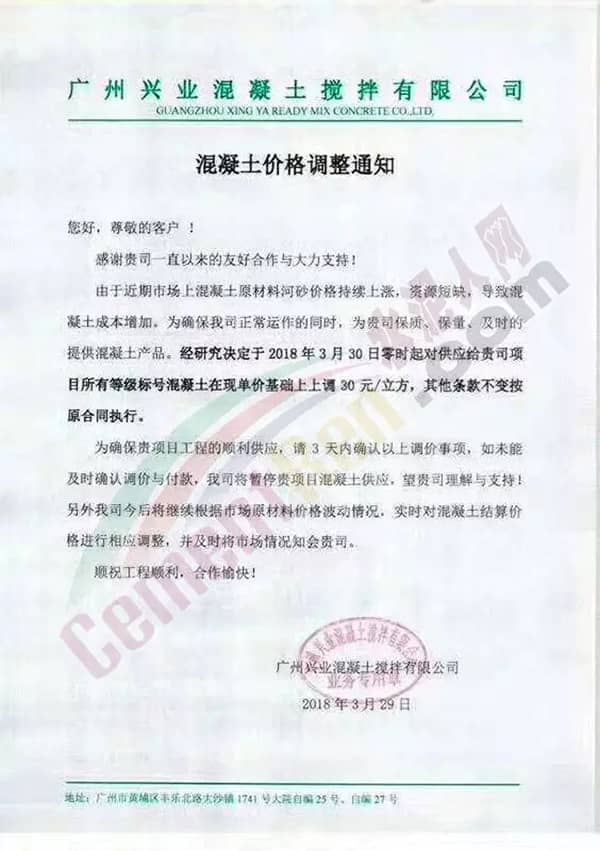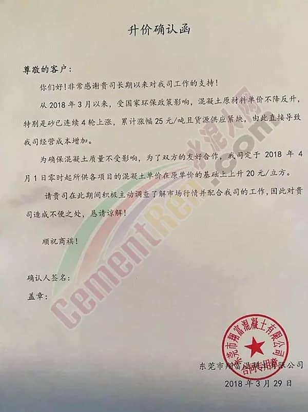 東莞市翔富混凝土有限公司《升價(jià)函》中提到,自2018年3月以來(lái),混凝土原材料不降反升,特別是砂已連續(xù)4輪上漲,累計(jì)漲幅25元/噸,且貨源供應(yīng)緊張。直接導(dǎo)至混凝土企業(yè)經(jīng)營(yíng)成本增長(zhǎng)。