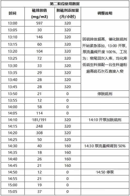 13:00時,尾氣硫排放瞬時值達(dá)到597mg/m3,為避免硫排放小時均值超標(biāo),立即開啟脫硫劑泵,按照320L/h開始脫硫劑的添加。添加后10分鐘左右硫排放開始顯著降低(數(shù)據(jù)如下表),12:30后硫排放穩(wěn)定在30mg/m3以內(nèi),12:50停止脫硫劑添加。停劑后硫排放逐步上升,至14:10時硫排放達(dá)到191mg/m3,為控制小時均值,立即開始添加催化脫硫劑,但加劑后硫排放仍持續(xù)上升,14:20排放值達(dá)到308mg/m3,14:25硫排放降至50mg/m3以內(nèi)。14:30因硫排放值低,降低催化脫硫劑添加量至160L/h,硫排放任持續(xù)穩(wěn)定在低位,14:50停止催化脫硫劑添加,第二階段使用結(jié)束。