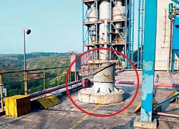 2、水泥廠預(yù)熱器系統(tǒng)下料管清堵孔處用跳板搭設(shè)簡(jiǎn)易平臺(tái),無防墜落措施,無逃生通道。作業(yè)過程容易出現(xiàn)人員高處墜落傷害;如果出現(xiàn)熱物料異常噴出,作業(yè)人員無法逃離,還會(huì)造成熱物料的高溫灼燙傷害。