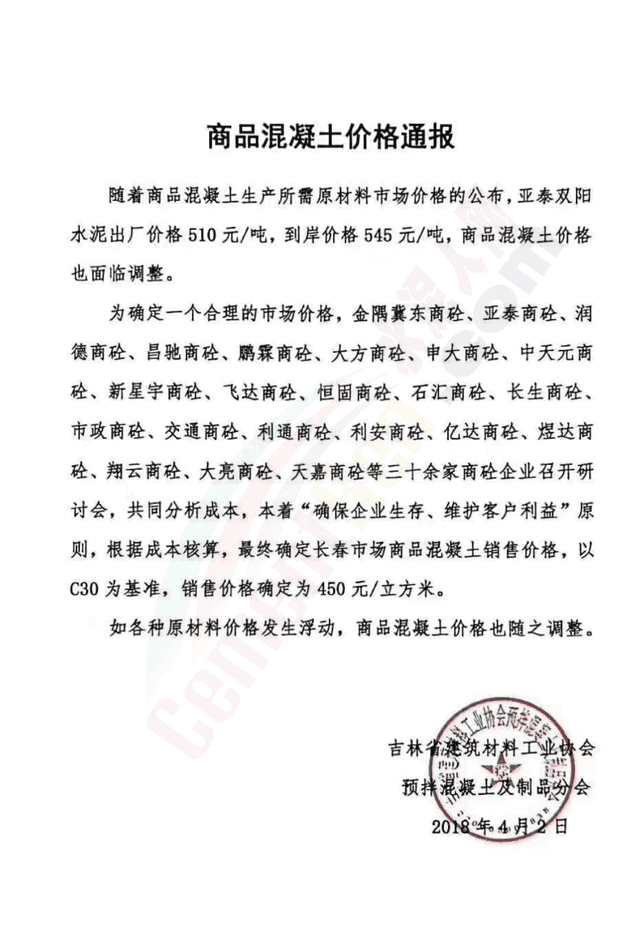 為確定一個合理的市場價格,金隅冀東商砼、亞泰商砼、潤德商砼、昌馳商砼、鵬霖商砼、大方商砼、中天元商砼、新星宇商砼、飛達商砼、石匯商砼、長生商砼、市政商砼、交通商砼、利通商砼、利安商砼、億達商砼、煜達商砼、翔云商砼、大亮商砼、天嘉商砼等三十余家商砼企業(yè)召開研討會,共同分析,本著“確保企業(yè)生存、維護客戶利益”原則,根據(jù)成本核算,最終確定長春市場商品混凝土銷售價格,以C30為基準,銷售價格確定為450元/立方米。