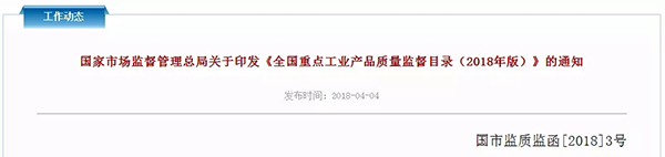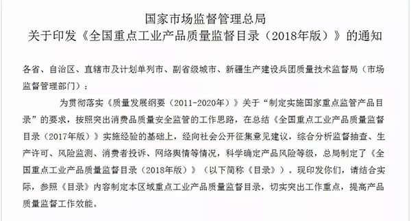 《全國重點(diǎn)工業(yè)產(chǎn)品質(zhì)量監(jiān)督目錄(2018年版)》