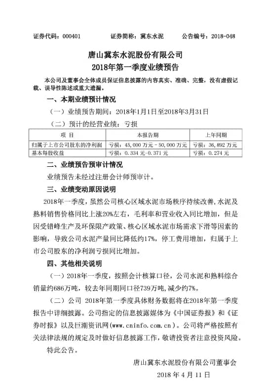 【水泥人網(wǎng)】冀東水泥(000401)4月10日晚披露業(yè)績預(yù)告,公司預(yù)計(jì)今年一季度虧損4.5億至5億元,上年同期虧損3.69億元。報(bào)告期內(nèi),公司核心區(qū)域水泥及熟料銷售價(jià)格同比上漲20%左右,但是因受錯(cuò)峰生產(chǎn)及環(huán)保限產(chǎn)政策、市場需求下滑等因素的影響,導(dǎo)致公司水泥產(chǎn)量同比降低約17%,停工費(fèi)用增加。