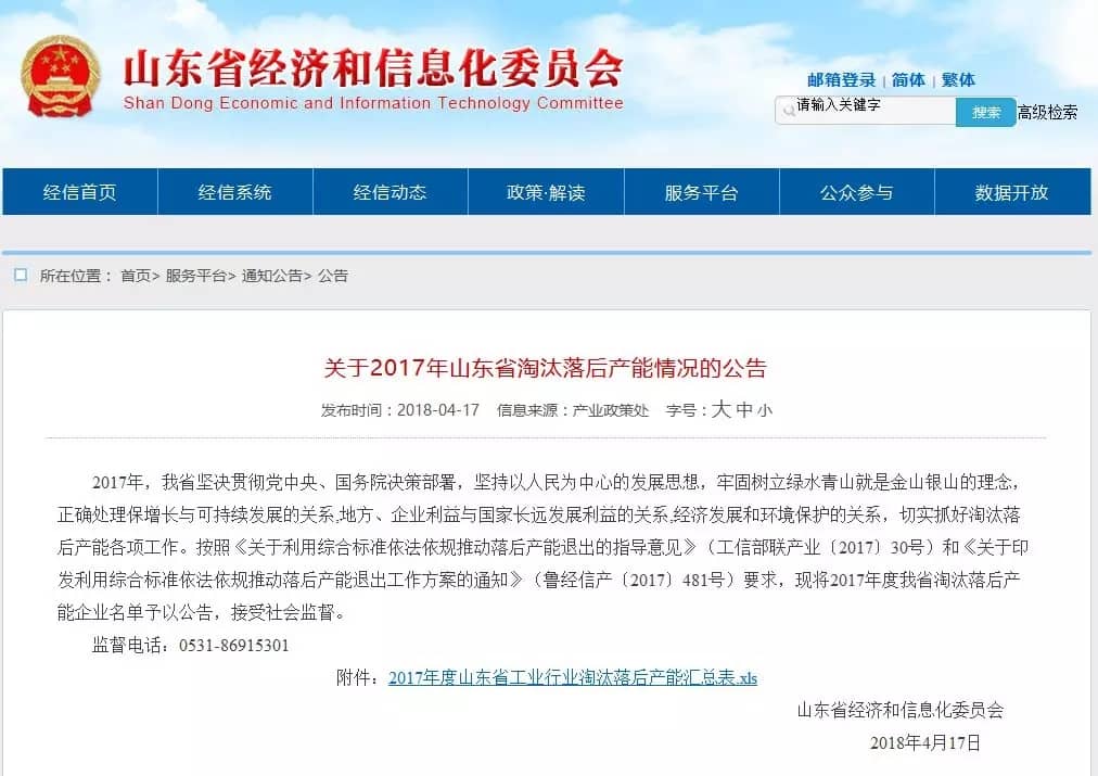 按照《關(guān)于利用綜合標(biāo)準(zhǔn)依法依規(guī)推動(dòng)落后產(chǎn)能退出的指導(dǎo)意見(jiàn)》(工信部聯(lián)產(chǎn)業(yè)〔2017〕30號(hào))和《關(guān)于印發(fā)利用綜合標(biāo)準(zhǔn)依法依規(guī)推動(dòng)落后產(chǎn)能退出工作方案的通知》(魯經(jīng)信產(chǎn)〔2017〕481號(hào))要求,將2017年度我省淘汰落后產(chǎn)能企業(yè)名單予以公告,并接受社會(huì)監(jiān)督。