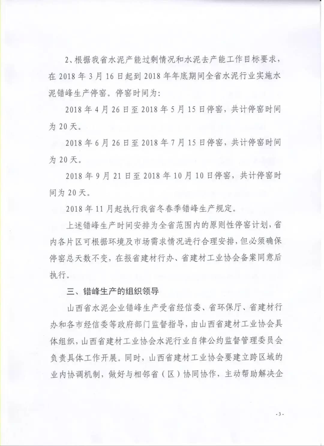 【水泥人網(wǎng)】據(jù)水泥人網(wǎng)了解,山西省根據(jù)產(chǎn)能過剩實際情況和水泥去產(chǎn)能工作目標的要求,在2018年3月16日起到2018年年底期間全省水泥行業(yè)實施錯峰生產(chǎn)停窯,停窯時間為:
