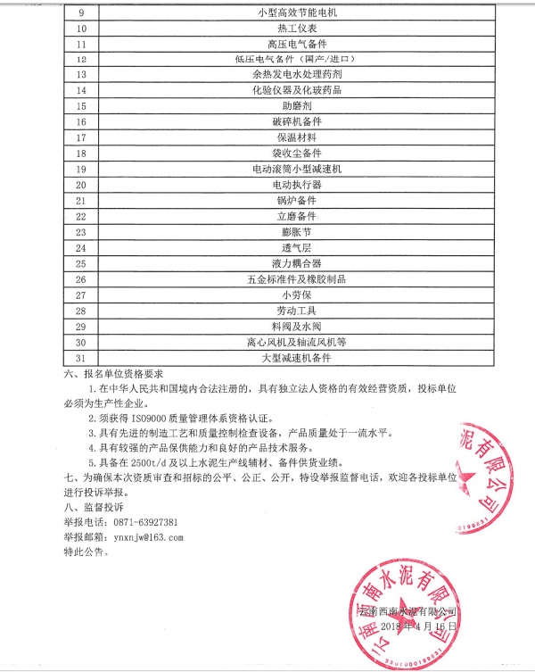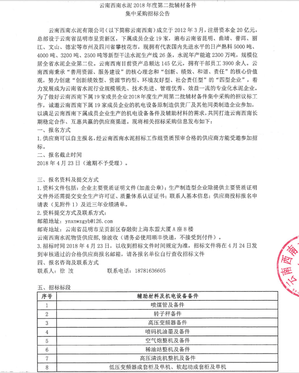【水泥人網(wǎng)】云南西南水泥有限公司(以下簡稱云南西南)成立于2012年3月,注冊資本金20億元,總部設(shè)于云南省昆明市呈貢新區(qū),下屬成員企業(yè)19家,遍布云南省昆明、曲靖、普洱、麗江、文山、德宏等市州及四川省攀枝花市,現(xiàn)擁有代表國內(nèi)先進(jìn)水平的日產(chǎn)熟料5000噸、4000噸、3200噸、2500噸等新型干法水泥生產(chǎn)線26條,水泥年產(chǎn)能逾2300萬噸,規(guī)模位居全省水泥企業(yè)第二位。云南西南目前資產(chǎn)總額達(dá)145億元,擁有干部員工3900余人。云南西南秉承“善用資源、服務(wù)建設(shè)”的核心理念和“創(chuàng)新、績效、和諧、責(zé)任”的核心價(jià)值觀,努力創(chuàng)建“創(chuàng)新績效型、資源節(jié)約型、環(huán)境友好型、社會責(zé)任型”的“四型企業(yè)”,著力發(fā)展成為云南省水泥行業(yè)規(guī)模領(lǐng)先、技術(shù)先進(jìn)、管理優(yōu)秀、效益一流的專業(yè)化水泥企業(yè)。為了做好云南西南下屬19家成員企業(yè)2017年度生產(chǎn)用第二批輔材備件集中采購的招議標(biāo)工作,誠邀云南西南下屬19家成員企業(yè)的機(jī)電設(shè)備原制造供貨廠及其它同類制造企業(yè)參加,以滿足云南西南下屬成員企業(yè)生產(chǎn)的機(jī)電設(shè)備備件及輔助材料的需求,共同打造云南西南長期穩(wěn)定合作、互惠共贏的供應(yīng)商渠道。現(xiàn)將相關(guān)招標(biāo)采購信息發(fā)布如下: