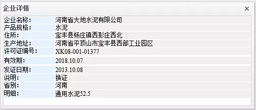 據(jù)查詢,河南省平頂山市大地水泥有限公司,生產(chǎn)地址位于河南省平頂山市寶豐縣西部工業(yè)園區(qū)。生產(chǎn)許可證編號為XK08-001-01377,生產(chǎn)許可證有效期至2018年10月7日。