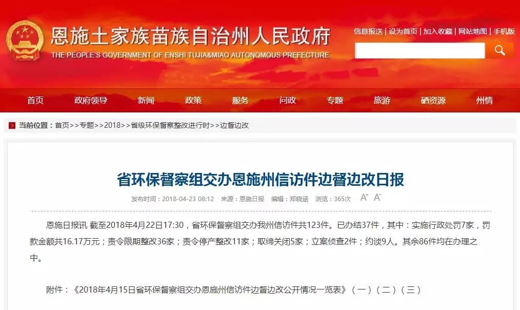 截至2018年4月22日17:30,湖北省環(huán)保督察組交辦恩施州信訪件共123件。已辦結(jié)37件,其中:實施行政處罰7家,罰款金額共16.17萬元;責令限期整改36家;責令停產(chǎn)整改11家;取締關(guān)閉5家;立案偵查2件;約談9人。其余86件均在辦理之中。