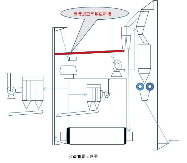 根據(jù)1#磨系統(tǒng)的旋風筒(雙筒)收集的物料分析,有30-40%的成品進入磨內(nèi)再粉磨,形成了磨機過粉磨現(xiàn)象。對旋風筒(雙筒)的物料走向進行改造,把兩個旋風筒其中的一個用斜槽把物料送到磨尾斗提進入選粉機進行選粉,(由于受磨尾500斗提提料能力的制約,暫對一個旋風筒的物料接斜槽改入磨尾500斗提,)直接經(jīng)選粉機進入成品。