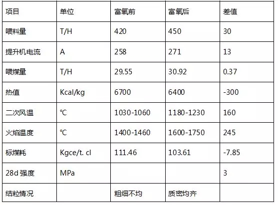 據(jù)了解,莒州水泥此富氧燃燒改造項目自完成以來,窯至今已高產(chǎn)平穩(wěn)運(yùn)行近五個月,熟料日產(chǎn)量平均提高400噸(標(biāo)題及文中所有數(shù)據(jù)按照420噸計),增產(chǎn)率達(dá)到6.7%。產(chǎn)量穩(wěn)定期間,通過中控顯示喂煤量計算,平均節(jié)煤率達(dá)到8%以上熱工標(biāo)定煤耗降低7.8kgce/t.cl。火焰溫度平均提高200℃以上(隨煤粉熱值、富氧純度、燃燒器參數(shù)改變),二次風(fēng)溫平均提高150℃左右,余熱發(fā)電也得到了較明顯的提高,窯操反饋喂料量顯著增加,窯電流穩(wěn)定,火焰剛度好、強(qiáng)度高,熟料結(jié)粒、外觀、強(qiáng)度提高;熟料質(zhì)量顯著改善,28d強(qiáng)度增加3Mpa,f-cao合格率提高。窯抗波動能力顯著提高,中控員操作更加省心。