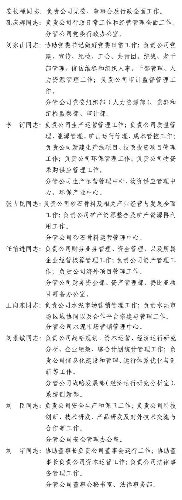 張占民:男,漢族,1964年2月出生,籍貫河北隆堯,中共黨員,大學(xué)學(xué)歷,高級工程師。1982年12月參加工作,1989年6月畢業(yè)于河北省測繪職工中等專業(yè)學(xué)校地圖制圖專業(yè)(中專),1994年10月加入中國共產(chǎn)黨,2005年12月畢業(yè)于南開大學(xué)工商企業(yè)管理專業(yè)(大學(xué))?,F(xiàn)任唐山冀東水泥股份有限公司總經(jīng)理助理、砂石骨料運(yùn)營管理中心經(jīng)理。1982.12-1986.09邢臺礦務(wù)局章村煤礦工人;1986.09-1989.06河北省測繪職工中等專業(yè)學(xué)校制圖專業(yè)學(xué)習(xí);1989.06-1993.06邢礦集團(tuán)章村礦技術(shù)科技術(shù)員;1993.06-1997.04章村礦水泥廠化驗(yàn)室副主任、主任;1997.04-1999.07章村礦多種經(jīng)營開發(fā)總公司辦公室主任;1999.07-2002.02邢臺礦務(wù)局水泥廠辦公室主任、化驗(yàn)室主任;2002.02-2002.11章村礦水泥廠辦公室主任、支部委員會(huì)副書記;(其間:1998.09-2002.07在河北理工學(xué)院材料工程系無機(jī)非金屬材料專業(yè)在職大專學(xué)習(xí))2002.11-2003.09河北金牛能源股份有限公司水泥廠生產(chǎn)部副經(jīng)理;2003.09-2004.02河北金牛能源股份有限公司水泥廠化驗(yàn)室主任;2004.02-2005.01河北金牛能源股份有限公司水泥廠化驗(yàn)室黨支部書記兼化驗(yàn)室主任;2005.01-2005.06河北金牛能源股份有限公司水泥廠化驗(yàn)室黨支部書記、銷售公司經(jīng)理;2005.06-2006.06河北金牛能源股份有限公司水泥廠銷售公司黨支部書記、經(jīng)理;(其間:2003.12-2005.12在南開大學(xué)工商企業(yè)管理專業(yè)在職大學(xué)學(xué)習(xí))2006.06-2007.08河北海天建設(shè)有限公司經(jīng)理;2007.08-2010.03河北宙石水泥有限公司經(jīng)理;2010.03-2015.02邯鄲涉縣金隅水泥有限公司經(jīng)理;2015.02-2017.01邯鄲涉縣金隅水泥有限公司經(jīng)理、邢臺金隅詠寧水泥有限公司黨委書記、董事長;2017.01-2017.06唐山冀東水泥股份有限公司砂石骨料運(yùn)營管理中心經(jīng)理;2017.06至今唐山冀東水泥股份有限公司總經(jīng)理助理、砂石骨料運(yùn)營管理中心經(jīng)理。