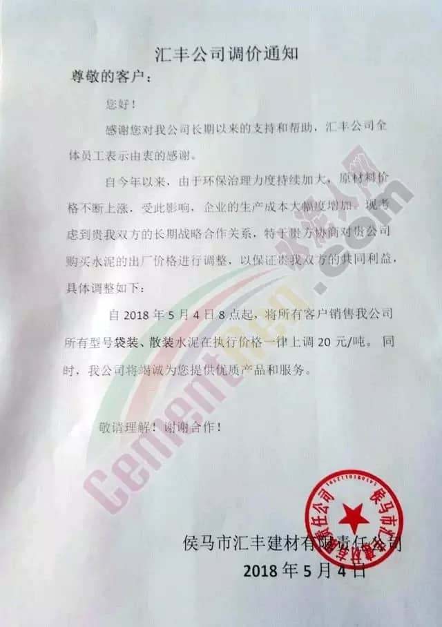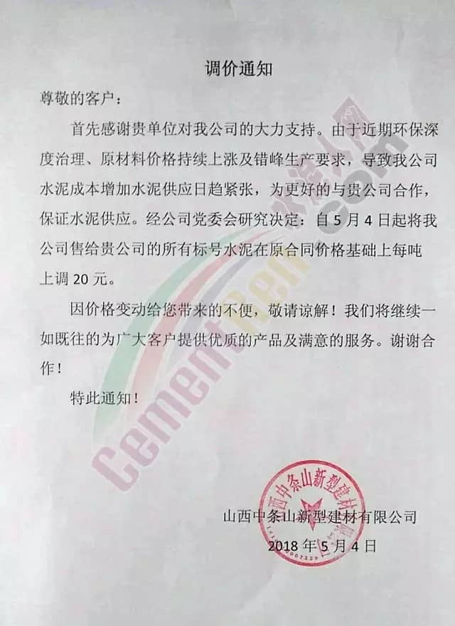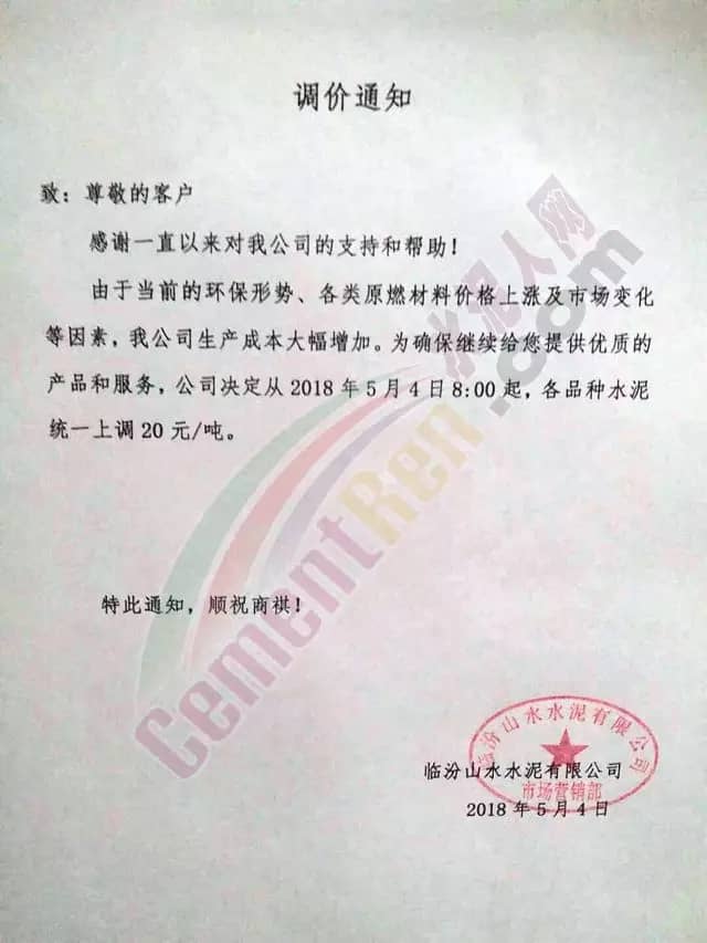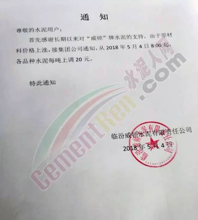 水泥人網(wǎng)5月4日消息,山西南部地區(qū)(晉南)多家企業(yè)通知下游客戶各標(biāo)號水泥在原價(jià)格基礎(chǔ)上上調(diào)20元/噸。