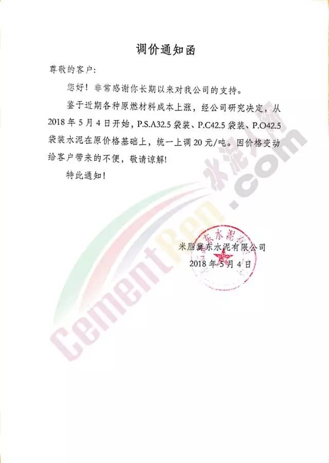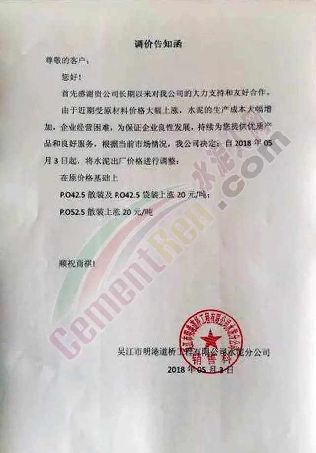 同期,甘肅平?jīng)龊B菟嗤ㄖ掠慰蛻?,根?jù)當(dāng)前公司的產(chǎn)銷形勢,PO42.5散裝水泥在原價(jià)基礎(chǔ)上上調(diào)15元/噸。