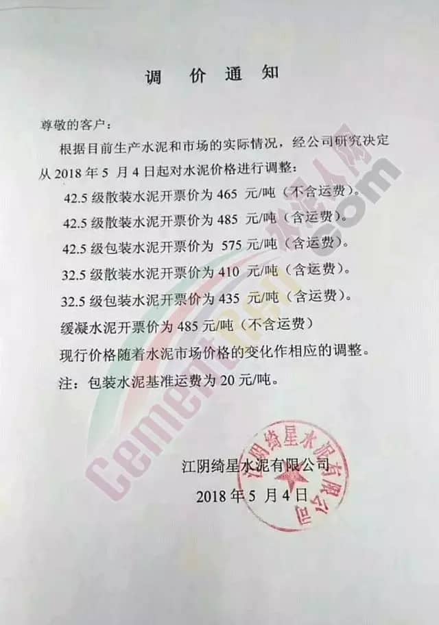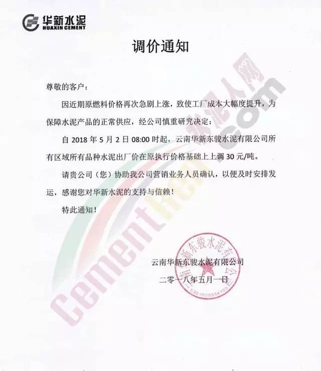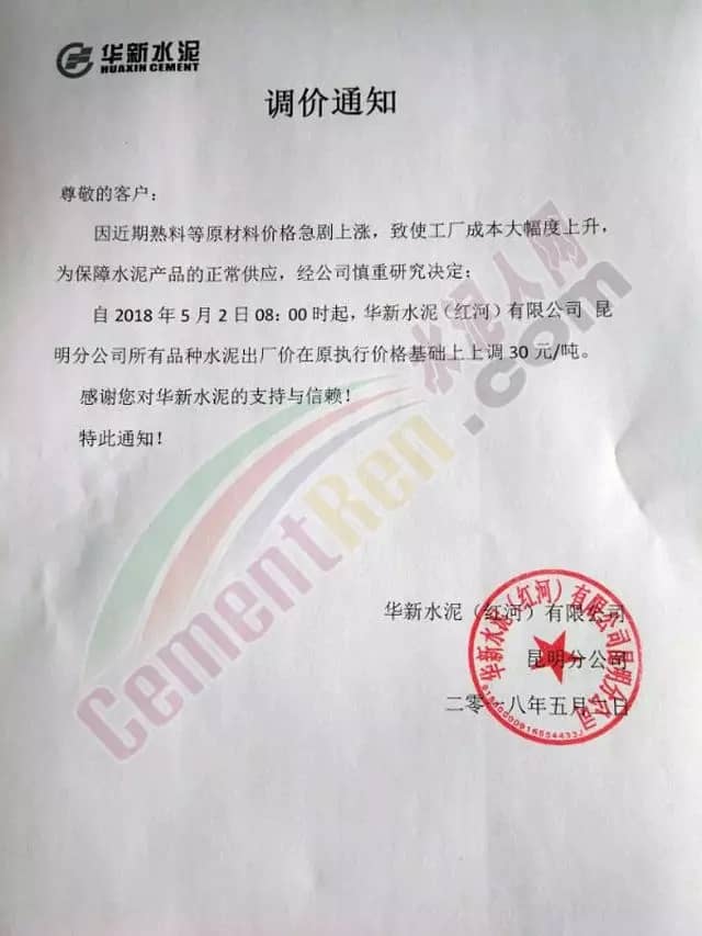 據(jù)水泥人網(wǎng)了解,自5月1日以來,大昆明區(qū)域,華新水泥、昆鋼嘉化等多家水泥企業(yè)通知上調(diào)水泥價(jià)格,漲幅在30元/噸。